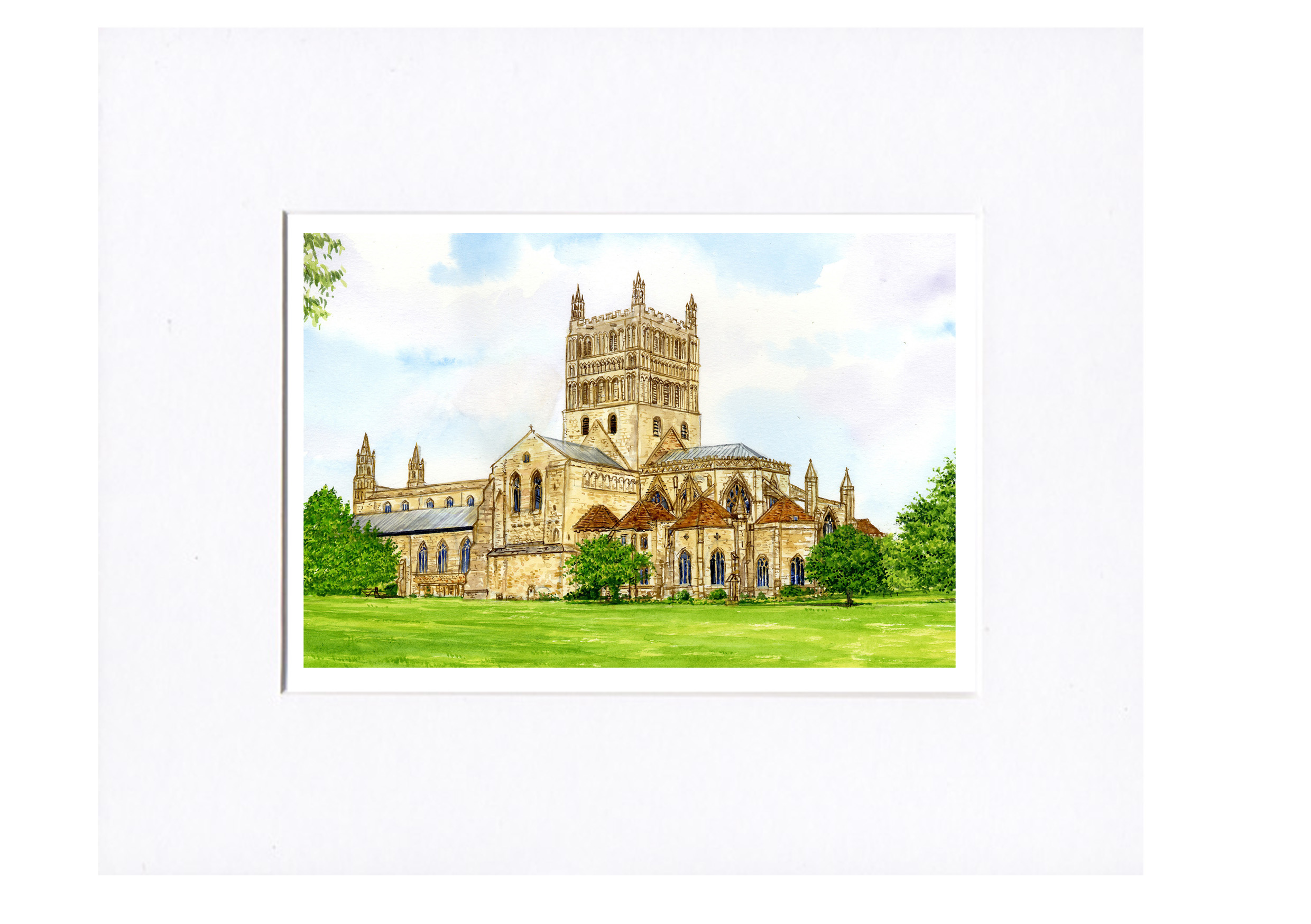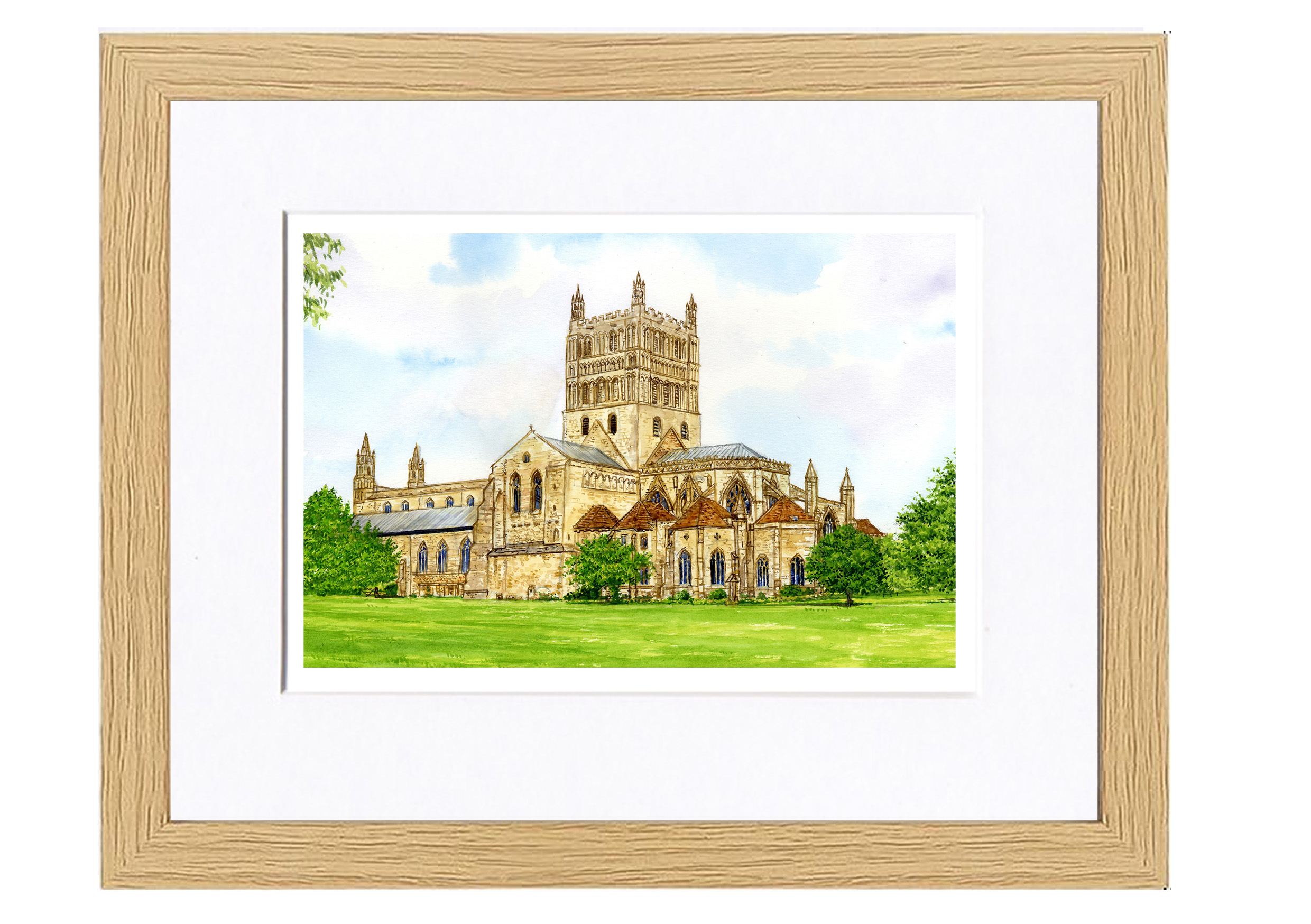 A Giclee Print of my watercolour painting of Tewkesbury, in Gloucestershire, first time I’ve painted this iconic building. Presented In a White 8 x 10 inch mount ,and framed in an Oak effect frame. Perspex safety glass.