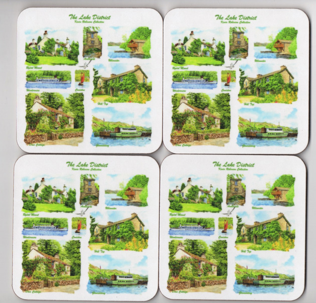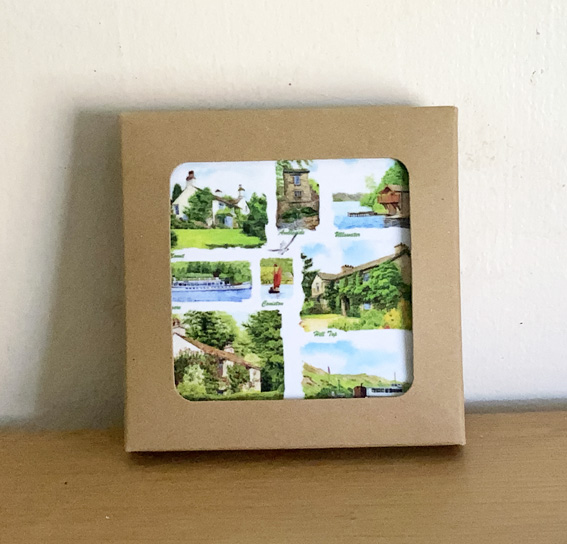 Set of 4 coasters of the Lake District taken from my  Paintings on. Scenes of Rydal Mount, Ambleside, Hill Top, Dove Cottage & more. 10 x 10 cm. Cork backed.